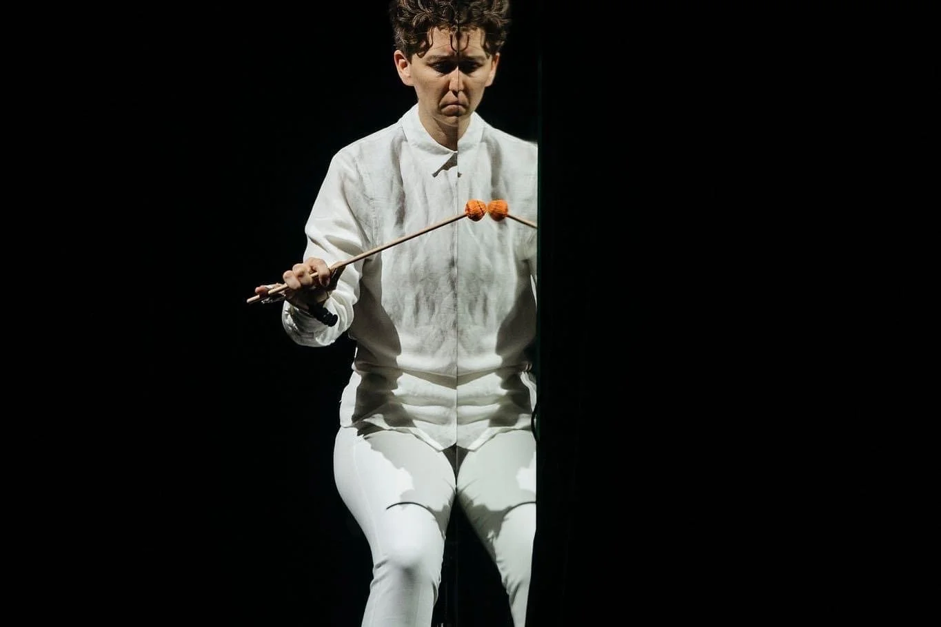 “I/O”, for soloist with mirror, feedback (microphone-speaker set up embedded in the mirror and the body of the performer), amplified objects and percussion, and 8-channel sound (addcorder). Premiered during Ultima 2022 by Jennifer Torrence, for whom the piece was composed.